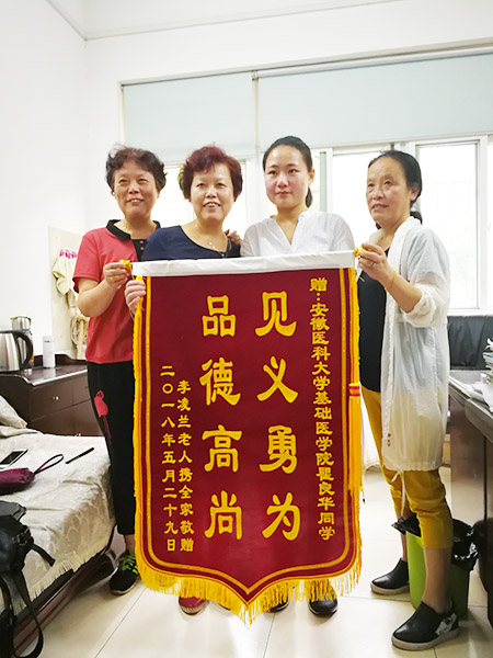 5月30日上午,合肥市民鲍女士带着锦旗来到了我校,代表全家表达对基础医学院2017级人体解剖学专业研究生瞿良华同学热心救助其母亲的感谢之情。