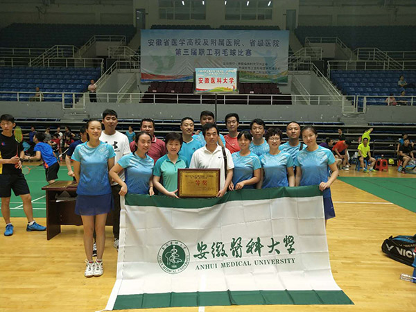 6月9日至10日,安徽省医学高校及附属医院、省直医院第三届职工羽毛球比赛在蚌埠市龙湖体育馆举行。来自全省医疗战线的17支队伍,近240多名运动员参加了比赛。我校代表队续写辉煌,再获第一名的佳绩。