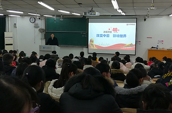 12月15日晚,校党委书记李俊教授在14302教室为2018级预防、妇幼专业180余位同学上了三节“形势与政策”课,授课专题为《改革开放40年:改变中国,影响世界》。