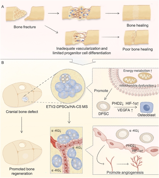 近日,我校口腔医学院徐建光副教授、王元银教授联合首都医科大学周建教授课题组,在《生物活性材料(Bioactive Materials)》(IF=18.9)发表题为《ETV2调节PHD2-HIF-1α轴控制代谢重编程促进血管化骨再生(ETV2 regulating PHD2-HIF-1α axis controls metabolism reprogramming promotes vascularized bone regeneration)》的学术论文。