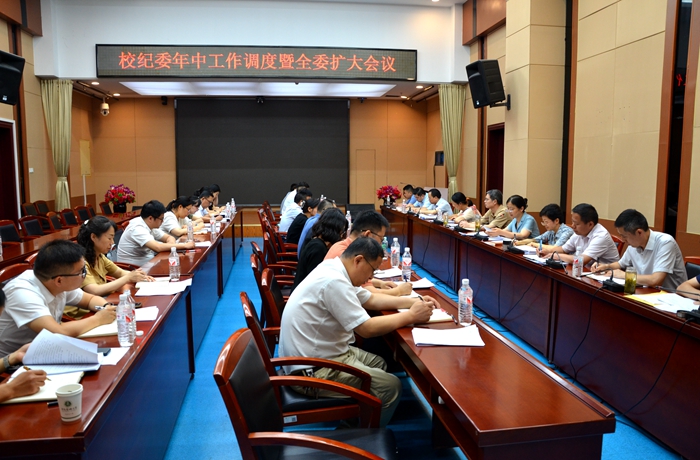 7月5日上午,学校纪委召开年中工作调度暨全委扩大会议,集中学习中共中央政治局常委、中央纪委书记李希在中央纪委国家监委机关警示教育会上的讲话精神,梳理总结学校上半年纪检监察工作情况,部署下半年重点任务。校纪委书记、省监委驻校监察专员黄新美主持会议并讲话。