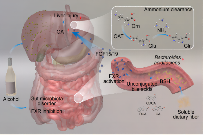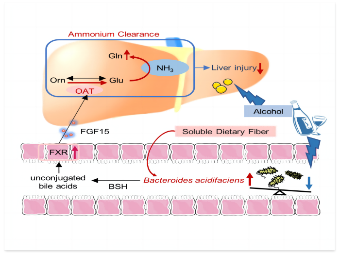 7月2日,我校王华教授团队在《细胞-宿主与微生物(Cell Host & Microbe)》杂志发表题为《膳食纤维通过产酸拟杆菌和随后的氨解毒减轻酒精性肝损伤 (Dietary fiber alleviates alcoholic liver injury via Bacteroides acidifaciens and subsequent ammonia detoxification)》的研究论文,揭示可溶性膳食纤维通过“肠-肝轴”减轻酒精相关性肝损伤。我校炎症免疫性疾病安徽省实验室、第一附属医院王华教授为本文的通讯作者,我校第一附属医院博士研究生沈海源、硕士研究生周亮亮和章昊为共同第一作者,第一附属医院为第一作者单位。