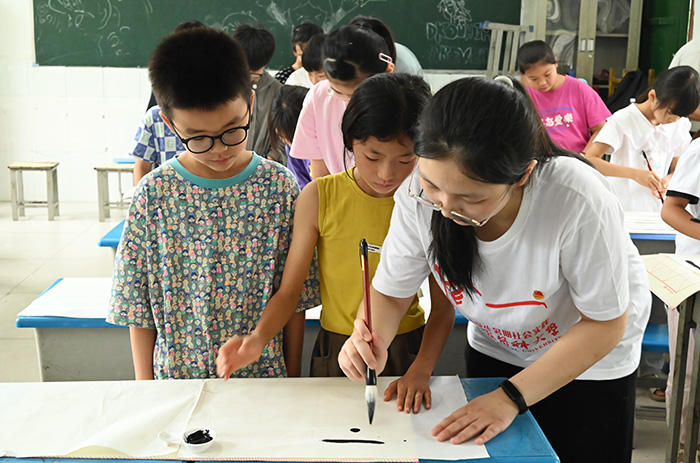 该实践团创新推普形式,将中华优秀传统文化和爱国主义教育融入相关课程,将学校“新六艺”特色融入推普教育教学,为岳张集镇中心校的孩子们带去了精彩纷呈的文化艺术课。不仅有太极拳和黄梅戏的教学展示,还邀请了当地知名书法家以及淮南剪纸非遗传承人进行书法和剪纸教学。实践队成员积极与孩子们互动,教室氛围其乐融融。活动中,师生们还共同欣赏了凤台县花鼓灯艺术家的精彩表演,感受国家级非物质文化遗产花鼓灯的艺术魅力。