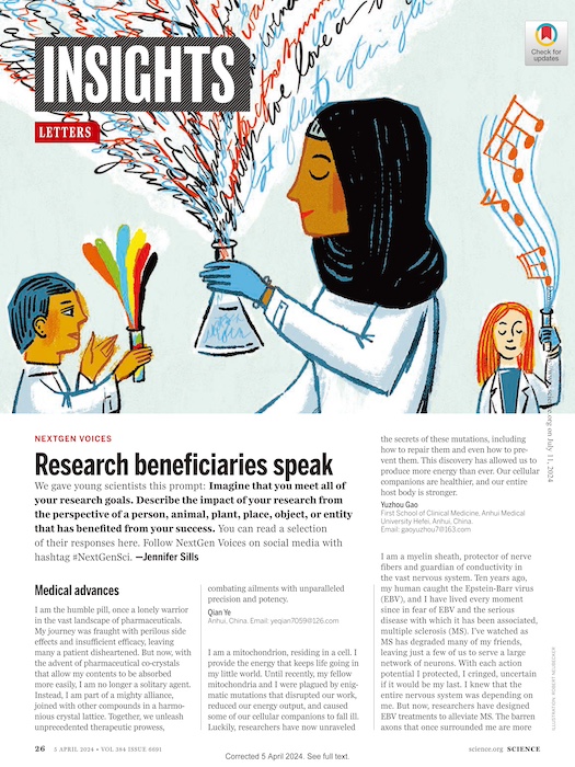 近日,我校第一临床医学院2021级临床医学(“5+3”一体化)专业本科生高御洲作为独立作者,在国际顶级期刊《科学(Science)》(中科院一区Top,IF = 44.7)《下一代之声(NextGen VOICES)专栏,发表了题为《科研受益者之声(Research Beneficiaries Speak)》的通讯短评,我校为第一作者单位。这也是该院本科生再次在《科学》期刊发表短评。