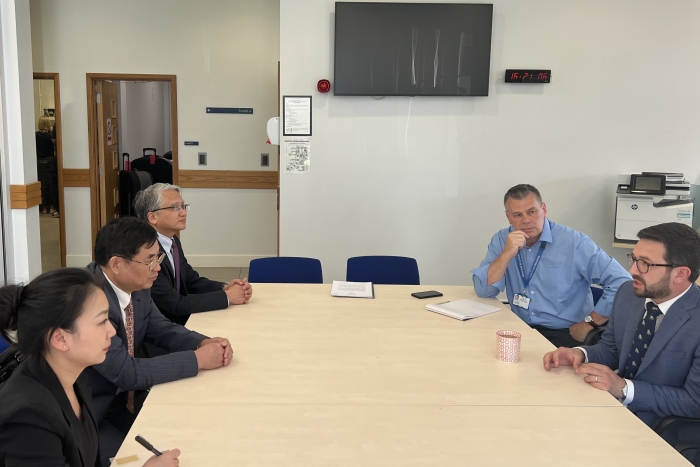 我校代表团还实地调研了科尔切斯特医院各科室。与科尔切斯特医院相关负责人交流中,谢瑞瑾详细介绍了我校的办学历史和发展现状,同对方就语言文化交流、医护人员培训、科研合作等方面的合作进行深入洽谈并达成共识。