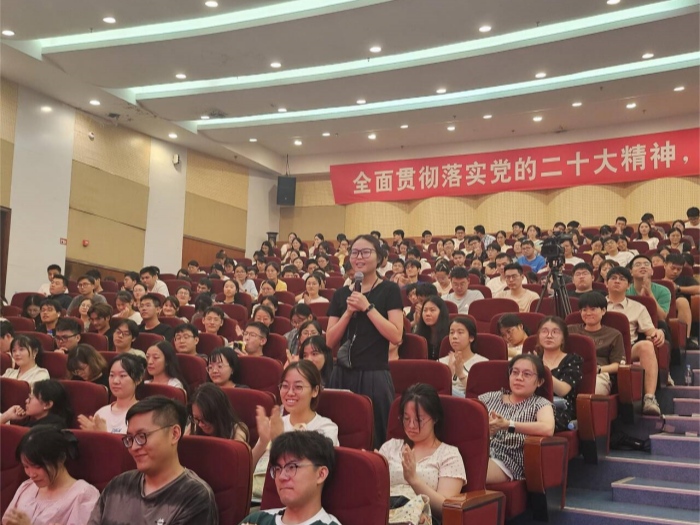 校党委研工部部长潘莉莉主持报告会。本次报告会线上线下同步直播,全体2024级研究生新生和2023级“5+3”一体化学生共同聆听。(文/党委研工部 图/新闻中心)