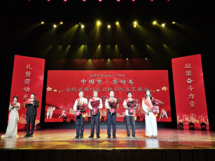 9月13日,“中国梦·劳动美”全省教科文卫体系统庆祝新中国成立75周年文艺展演活动在安徽艺术学院举办。我校劳模先进代表、“全国先进工作者”陶芳标教授应邀参加活动并接受献花。
