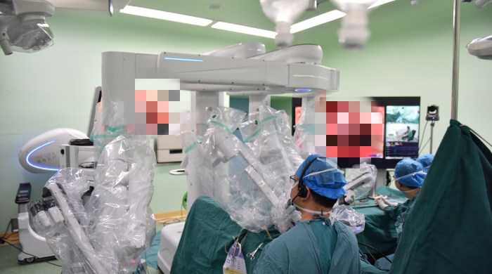 分离、切割、止血、缝合……机械臂在梁朝朝的远程操控下,干净利落、精准稳定地完成各个手术动作。手术在附属阜阳医院手术团队默契无间的配合下顺利完成,历时约1个小时。手术过程近乎无出血,机器人辅助大大降低了手术时长和术中出血量。