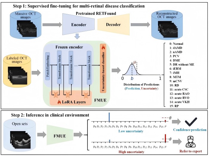12月19日,我校生物医学工程学院校聘副教授彭圆圆联合汕头大学·香港中文大学联合汕头国际眼科中心陈浩宇教授团队、新加坡科技研究局付华柱教授团队,在《细胞(Cell)》子刊《细胞医学报道 (Cell Reports Medicine)》(中科院一区Top, IF=11.7)上在线发表题为《结合不确定估计技术的基础模型在基于光学相干断层扫描的视网膜疾病诊断中增强了人工智能的可靠性(Enhancing AI Reliability: A Foundation Model with Uncertainty Estimation for Optical Coherence Tomography-based Retinal Disease Diagnosis)》的研究论文。彭圆圆,汕头大学·香港中文大学联合汕头国际眼科中心林艾迪,新加坡国立大学博士后王猛为共同第一作者;陈浩宇和付华柱为共同通讯作者,我校为第一作者单位。