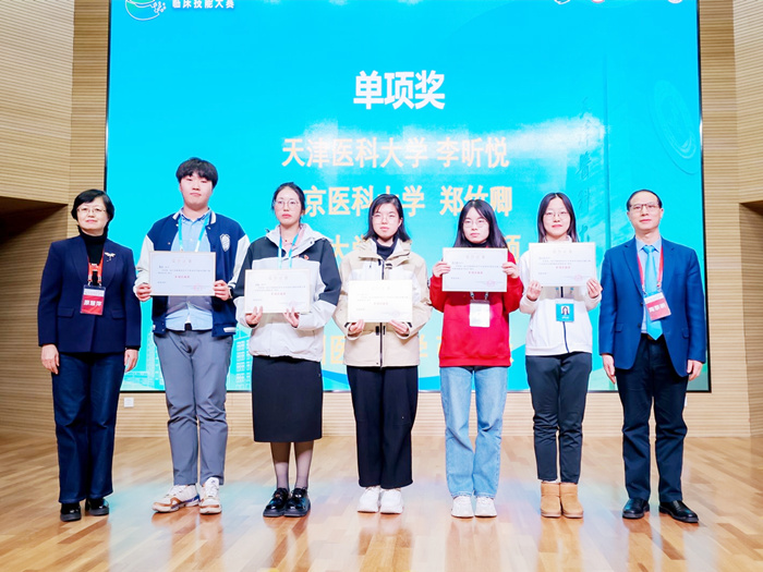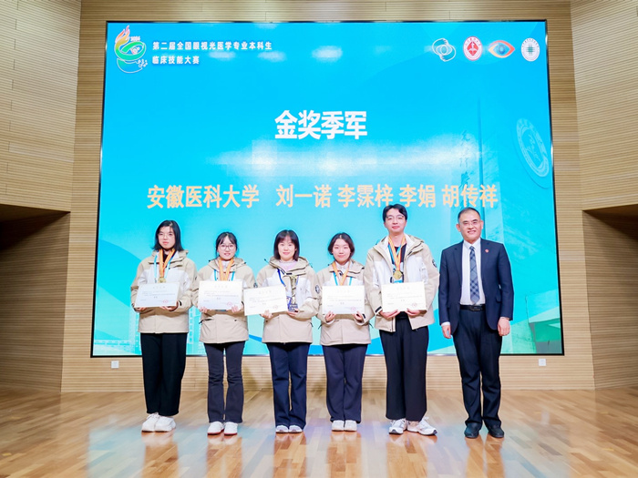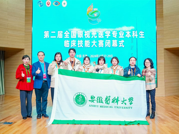 本次大赛由眼视光学国家级实验教学示范中心指导、天津医科大学承办,以“见眼见人,培育卓越人才;熟技通理,共筑健康中国”为主题,采用客观结构化临床技能考试(OSCE)的方式进行,设置四大模块、四个考站,赛题覆盖广泛,综合考察选手的基本理论、基础知识和基本技能、团队合作、人文关怀及临床思维能力等综合素质。大赛现场,来自全国19个院校眼视光医学专业的近百位本科生同场竞技,在门诊病史采集和眼科初始检查、外眼和眼前节检查、眼底检查、检影验光、主觉验光及老视检查、眼视光综合案例分析等项目进行比赛。我校第二临床医学院眼视光医学专业刘一诺、李霂梓、李娟、胡传祥四位同学组成华体会平台代表队参赛,团结协作、稳定发挥,充分展示了安医学子的专业素养和技能水平,得到组委会的肯定与赞赏,最终斩获金奖。刘一诺获个人单项奖,胡传祥获个人风采奖。