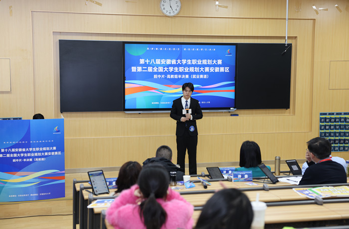 2024年12月24日至26日,由安徽省教育厅主办、我校承办的第十八届安徽省大学生职业规划大赛皖中片半决赛(高教组)在学校梅山路校区举办。来自合肥地区18所本科院校共计60位参赛选手进入半决赛,省内外高校及用人单位相关专家受邀担任评委。安徽省大中专毕业生就业指导中心主任张秋田,我校学术副校长张智深入赛场指导。