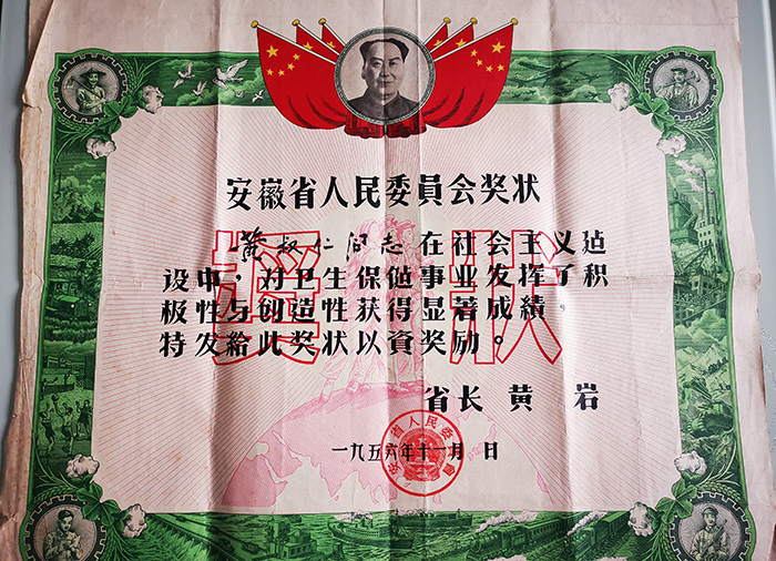 1956年,黄叔仁因在省内率先开展光学角膜移植术、人工晶状体植入术,获评安徽省社会主义建设积极分子及安徽省卫生系统先进工作者称号。“光学角膜移植术是我在东北进修时见习学到的,回校后先做动物实验,待张老师看了首肯后,再提出申请,等到批准后开始临床手术。此后断断续续做了一些,到1965年初,不足十年间共开展了68例,术后视力恢复≥0.3达78%。”