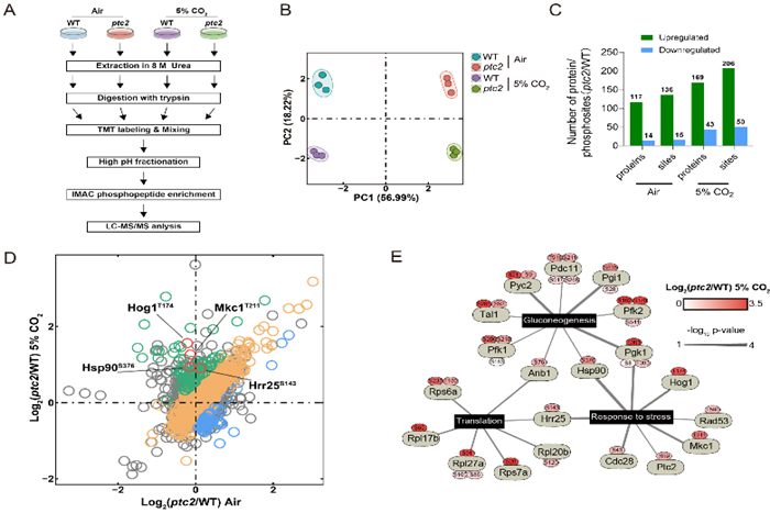 该项研究综合运用多种实验方法深入探究了真菌耐药机制。研究者通过定量磷酸化蛋白质组学实验,对比野生型和Ptc2突变体在空气及5% CO2条件下的差异,鉴定Ptc2潜在靶蛋白;借助体内免疫沉淀、体外GST pull-down等生化实验,明确Ptc2与Hsp90、Ssb1的相互作用及去磷酸化关系;利用荧光标记和体外重组实验,研究蛋白的相分离行为;构建小鼠系统性感染模型,评估CO2对棘白菌素治疗效果的影响以及体内耐药表型的诱导情况。