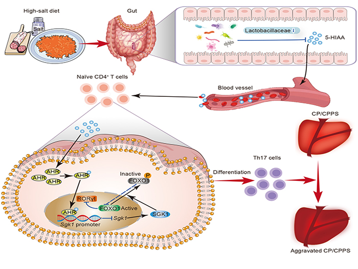 钠离子作为维持细胞生理功能的重要电解质,其代谢平衡对机体免疫稳态维持具有重要的调控作用。既往研究显示,高盐饮食(high-salt diet, HSD)可通过特异性诱导Th17细胞分化并促进其分泌IL-17等促炎因子,从而加剧溃疡性结肠炎、自身免疫性脑脊髓炎等多种免疫相关性疾病的进展。然而,关于HSD是否促进CP/CPPS的发生发展以及其中的关键调控机制,目前尚未见相关研究报道。