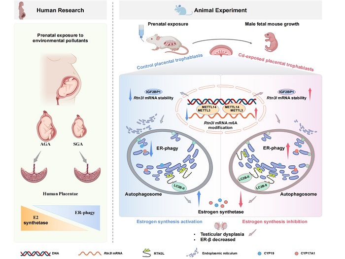 研究显示,妊娠期环境应激通过促进胎盘m6A修饰激活RTN3L依赖的内质网自噬,进而抑制雌二醇合成,最终导致胎睾发育损伤。研究结果为今后阐明胎源性不育症的发生机制并制定其精准防治方案提供科学依据。