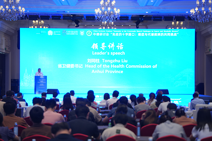 6月24日至25日,由我校承办的中德研讨会“免疫的十字路口:癌症与代谢疾病的共同挑战”在合肥举办。安徽省卫生健康委员会党组书记刘同柱、校党委书记王琦、校长翁建平以及德国奥斯纳布吕克大学生物医学系主任屈彬等领导与专家出席开幕式。