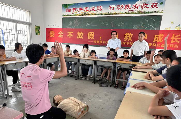 在黄泊渡小学教室里,一场别开生面的“急救训练营”小课堂正在进行。吕雄文走进教室,认真观摩实践团成员为孩子们带来的CPR(心肺复苏术)急救知识培训。实践团成员通过情景模拟,生动讲解CPR环境评估和意识判断要领,并演示胸外按压和人工呼吸动作规范,吕雄文不时点头肯定。课程结束后,吕雄文一行将提前准备的书包、文具和消暑营养品赠送给小学生,孩子们收到礼物后,脸上洋溢着灿烂的笑容。