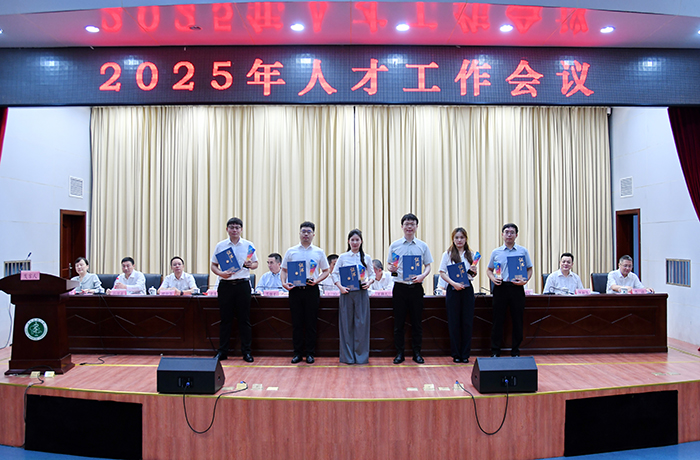 与会校领导为2025年青年后备人才和“引才大使”代表颁发证书和奖杯。