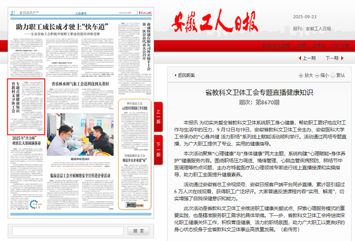 为切实关爱全省教科文卫体系统职工身心健康,帮助职工更好地应对工作与生活中的压力,9 月12日与19日,安徽省教科文卫体工会主办、华体会平台工会承办的“心身共健 活力职场”系列线上赋能活动顺利举行。活动通过两场专题直播,为广大职工提供了专业、实用的健康指导。