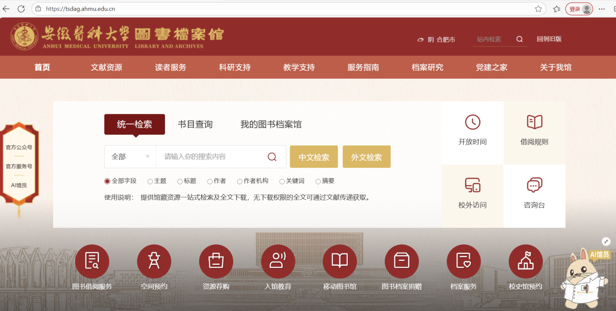 原图书馆门户网站域名https://lib.ahmu.edu.cn/已于近日停用,不可再访问。用户可通过新域名或点击学校官网华体会(中国)右上方快捷通道进入。