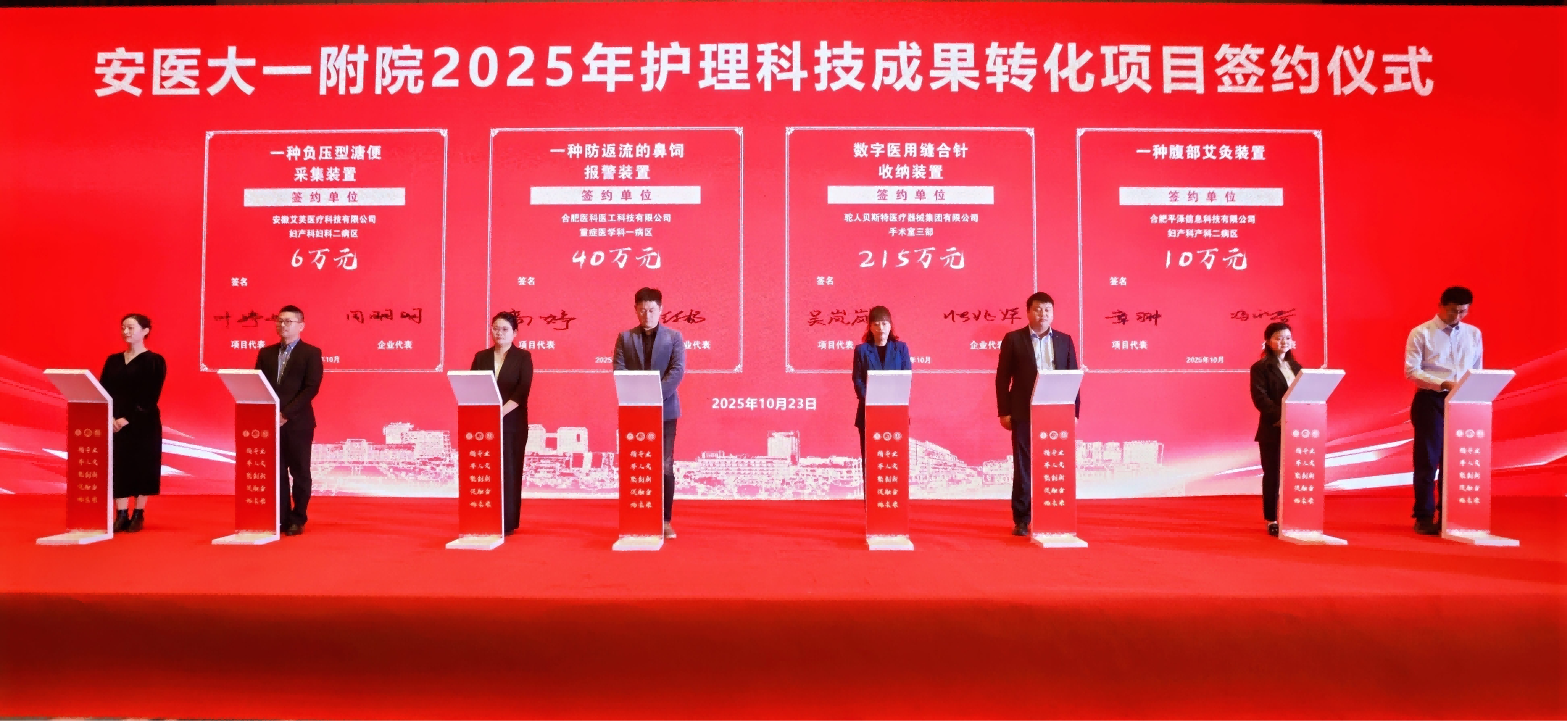 论坛期间举办了2025年度护理科技成果转化项目签约仪式,第一附属医院已有“数字医用缝合针收纳装置”“一种防返流的鼻饲报警装置”等12项护理科技成果完成转化,总转化金额达811.4万元。8个护理科技成果的发明人及合作企业代表来到现场,共同完成成果签署。