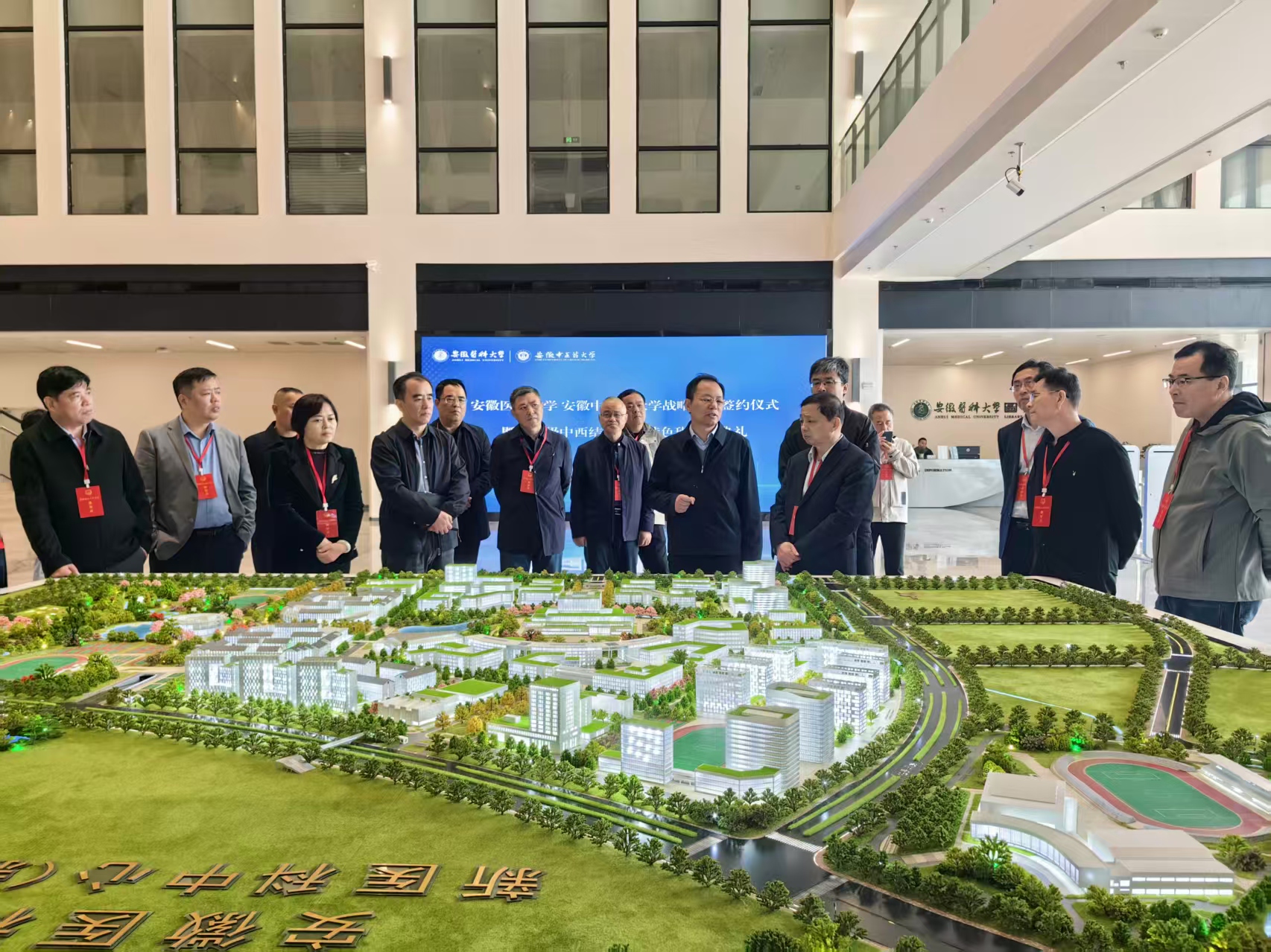 田仰华对成忠、杨帆一行的到访表示欢迎,并以“传承医学薪火,服务健康安徽”为主线,简要介绍了学校办学脉络与发展成就。他还结合规划沙盘与建设进度,详细介绍了新医科中心的空间布局、功能定位与建设愿景。
