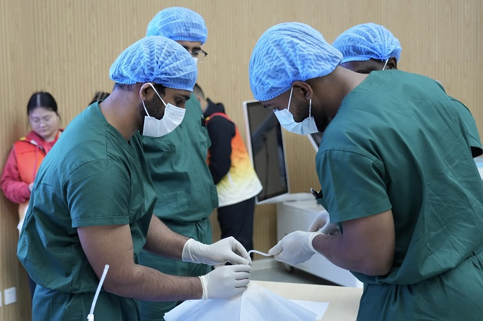接到比赛通知后,国际学院高度重视,委托第一附属医院高新院区临床技能培训中心负责技能培训,中心主任张志功担任总教练,国际学院负责参赛学生的组织与管理工作。经过积极动员,共有9名来华留学生报名参与。通过系统培训与严格考核,最终遴选出5名优秀学生代表学校赴南京参赛。