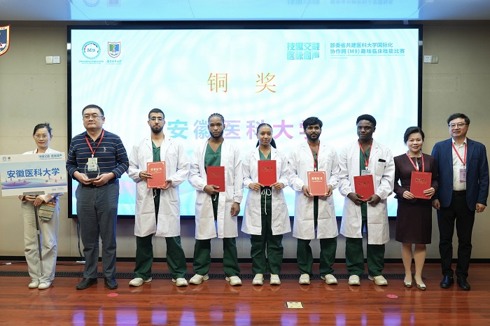 10月31日至11月2日,由部委省共建医科大学国际化协作网(M9)主办、南京医科大学承办的趣味临床技能比赛在南京医科大学江宁校区举行。来自中国医科大学、首都医科大学、南方医科大学等8所部委省共建医科大学的精英学子齐聚一堂,同场竞技。我校来华留学生代表队凭借出色发挥,以初赛第一名、决赛第四名的优异成绩,荣获铜奖。