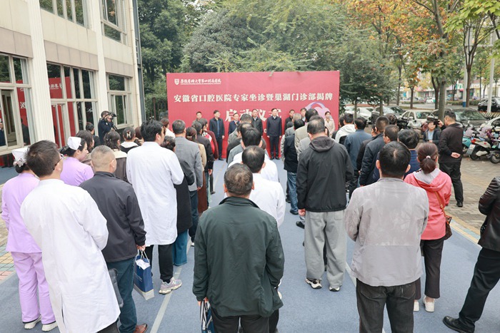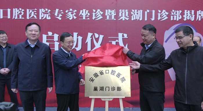 11月6日上午,安徽省口腔医院专家坐诊暨巢湖门诊部揭牌启动仪式在第四附属医院口腔医学中心门前广场举行。第四附属医院党委书记周典,院长谢栋栋,附属口腔医院(安徽省口腔医院)党委书记刘颀,院党委副书记、院长王元银及两院医护代表参加仪式。启动仪式由谢栋栋主持,相关领导共同为“安徽省口腔医院巢湖门诊部”揭牌。