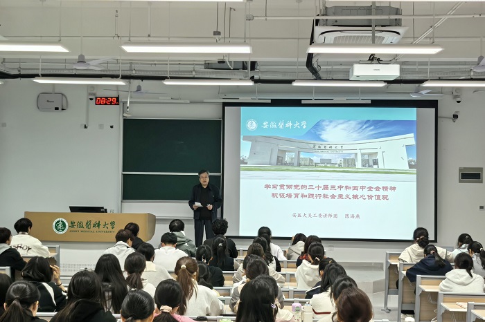 陈海燕从习近平总书记“青年要扣好人生的第一粒扣子”这一论述出发,系统回顾了自党的十八大以来,习近平总书记关于青年一代培育和践行社会主义核心价值观的重要论述,对党的二十届四中全会提出的“激发全民族文化创新创造活力,繁荣发展社会主义文化”进行重点阐述。他引用中国近代以来仁人志士的事例,从国家、社会和公民三个层面,深入浅出地向同学们阐释了社会主义核心价值观是一个民族赖以维系的精神纽带,是一个国家共同的思想道德基础。他还从“传承百年安医精神”等十个维度,教育引导学生筑牢信仰之基,做社会主义核心价值观的坚定信仰者、积极传播者、模范践行者。