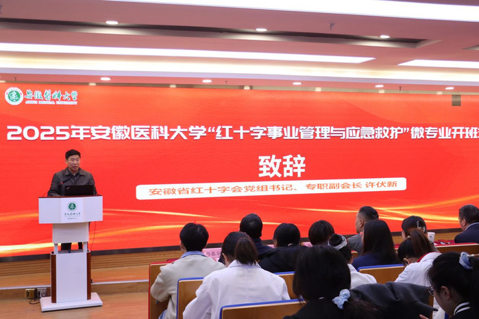 11月22日上午,我校“红十字事业管理与应急救护”省级微专业开班式在梅山路校区力行楼报告厅举行。安徽省红十字会党组书记、专职副会长许伏新,校党委常委、副校长吕雄文出席开班式并致辞。