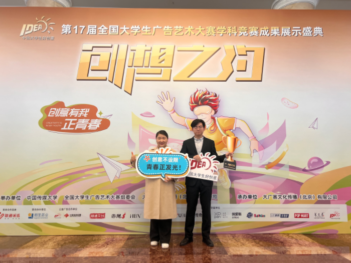 本届盛典由中国高等教育学会广告教育专业委员会指导,中国传媒大学、全国大学生广告艺术大赛组委会等共同举办。全国共有1912所高校参赛,参赛规模创历届之最。我校顾翔、潘静两位学子的作品,以独特的创作视角、严谨的内容编排及扎实的专业功底,在海量参赛作品中崭露头角,最终将文案类全国一等奖收入囊中。