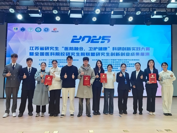 12月14日,2025年江苏省研究生“医防融合,卫护健康”科研创新实践大赛暨全国医科院校研究生院联盟研究生创新创业成果展演在南京医科大学附属泰州人民医院举行。我校八名参赛队员在大赛中脱颖而出,分别荣获相应赛道的二等奖和三等奖。我校荣获最佳组织奖。