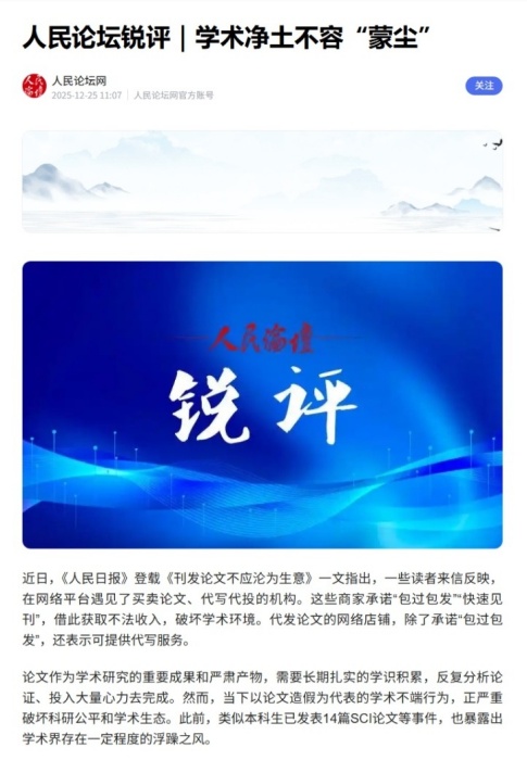 早在2016年,教育部就颁布《高等学校预防与处理学术不端行为办法》,规定包括买卖或代写论文等6种学术不端情形。今年11月,科技部会同有关部门部署开展学术不端撤稿论文专项整治行动,对涉嫌买卖论文等行为严肃开展调查和处理,彰显对学术不端的零容忍态度,体现国家维护良好学术生态的坚定决心。