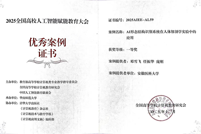会议由教育部高等学校计算机类专业教学指导委员会、全国高等学校计算机教育研究会、中国人工智能教育联席会联合主办,以“智创未来,赋能教育——构建人工智能时代的教育新生态”为主题,吸引了全国百余所高校的专家学者与一线教师参会,共同探讨和展示人工智能技术在高等教育改革中的创新应用。基础医学院AI教学团队以人体解剖学实验课程为平台,深度融入人工智能技术,成功研发“AI形态结构识别系统”。该系统能够智能识别各类解剖结构,并在此基础上构建了“人机互动、虚实结合、数据驱动”的智慧实验教学新模式,有效拓展了教学资源的边界,提升了教学过程的互动性与评价的科学性,为医学实验教学的数字化转型树立了新标杆。
