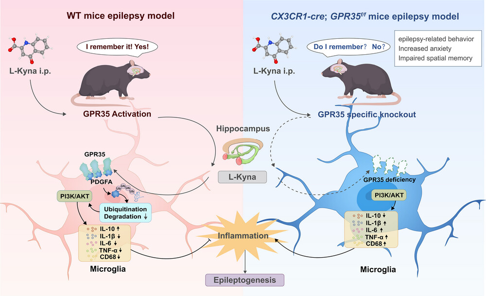 本研究采用临床样本、多种动物模型及多组学分析手段,首次提出小胶质细胞GPR35在癫痫中的重要保护作用。研究发现,GPR35在癫痫状态下在小胶质细胞中特异性上调,其缺失可显著加重癫痫发作、神经炎症反应及相关认知功能障碍。机制上,本研究取得了突破性发现:GPR35并非通过传统的GPCR信号转导模式发挥作用,而是直接与血小板衍生生长因子A(PDGFA)的第二个结构域(PDG2)发生蛋白质相互作用。这种结合抑制了PDGFA通过泛素-蛋白酶体途径的降解,从而稳定了PDGFA蛋白水平,进而激活下游的PI3K-AKT信号通路,最终抑制促炎因子释放、促进抗炎因子产生,发挥抑制癫痫发生和发展的作用。