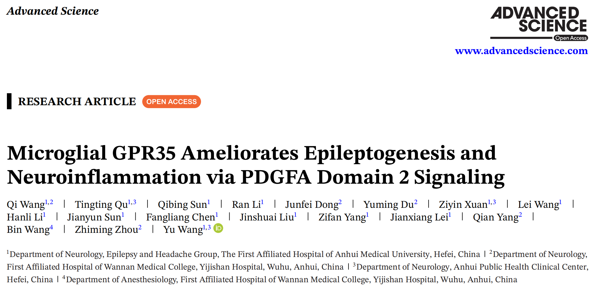 1月28日,我校第一附属医院神经内科王玉教授团队在国际权威期刊《先进科学(Advanced Science)》(中科院一区TOP期刊,IF5y:15.6)在线发表原创研究论文《小胶质细胞G蛋白偶联受体35通过血小板衍生生长因子A第2结构域信号通路减轻癫痫发生及神经炎症(Microglial GPR35 Ameliorates Epileptogenesis and Neuroinflammation via PDGFA Domain 2 Signaling)》,系统揭示了小胶质细胞GPR35通过PDGFA信号通路调控癫痫发生发展的新机制,为癫痫的疾病修饰治疗和精准干预策略提供了新的理论依据和潜在靶点。