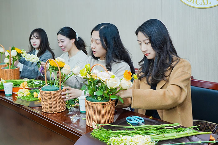 座谈会后,学校举办“巧手插花艺·同心庆百年”插花活动,由离退休人员工作处、继续教育学院承办。花艺老师现场讲解插花技巧,女教职工们亲手创作插花作品,在花香与欢笑中放松身心,寄托对美好生活的向往和对学校百年华诞的祝福。