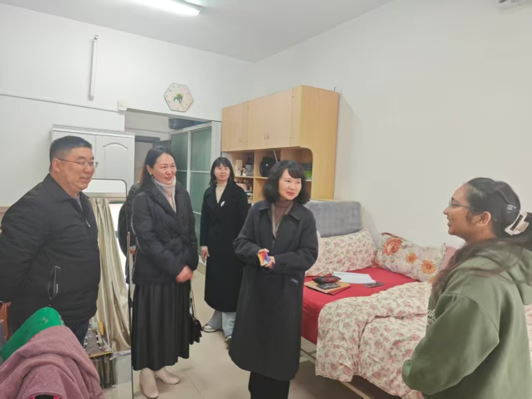 走访期间,洪静芳首先走进印度籍国际学生艾妮莎的宿舍,与她亲切交谈、促膝谈心,耐心倾听其在梅山路校区的学习生活日常,细致询问她对宿舍环境的适应情况、生活便利度及实际需求。艾妮莎对学校的关心与照顾表示衷心感谢,她表示,宿舍设施完善、管理规范,学习生活氛围浓厚,将珍惜学习机会,努力进取,不辜负学校的培养与期望。