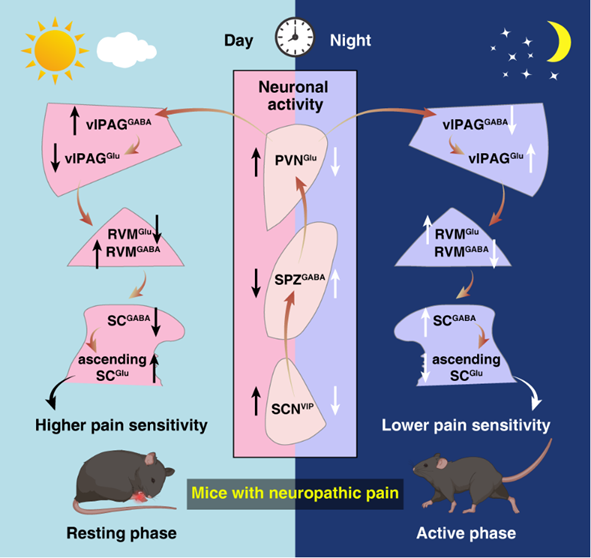 综上,本研究揭示了一条由大脑生物钟调控下行镇痛系统的神经环路,该环路活动的昼夜节律介导了疼痛昼夜差异性,这一机制为临床上优化疼痛治疗方案、完善时间疗法模式提供了理论依据。