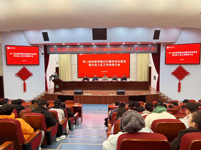 12月22日,第二临床医学院在图书馆第一报告厅召开2025届毕业生就业暨应征入伍工作动员大会。蜀山区人民政府征兵办公室参谋赵晓东、校党委学工部部长秦楠、校保卫处处长余谋武、第二临床医学院(第二附属医院)党委副书记鲍丙刚出席会议,学院学生党总支副书记余皖婉主持会议。