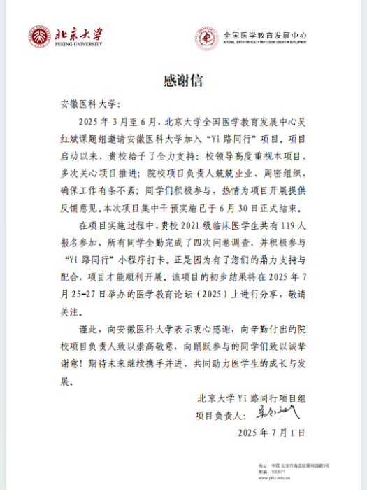 “Yi 路同行”项目由北京大学全国医学教育发展中心吴红斌课题组设计实施,是国内首次针对医学生发展的干预项目,旨在通过干预措施提升医学生职业承诺,促进其职业发展。第一临床医学院(第一附属医院)在校医学教育研究所的指导下,以“Yi路同行”项目为重要抓手,聚焦学生从基础课程学习向临床专业实践过渡的关键期,将思政教育与专业素养提升深度融合,为学生搭建起成长的桥梁。近日,北京大学全国医学教育发展中心也发来感谢信,对我校在“Yi路同行”项目中的全力支持表示了衷心感谢。
