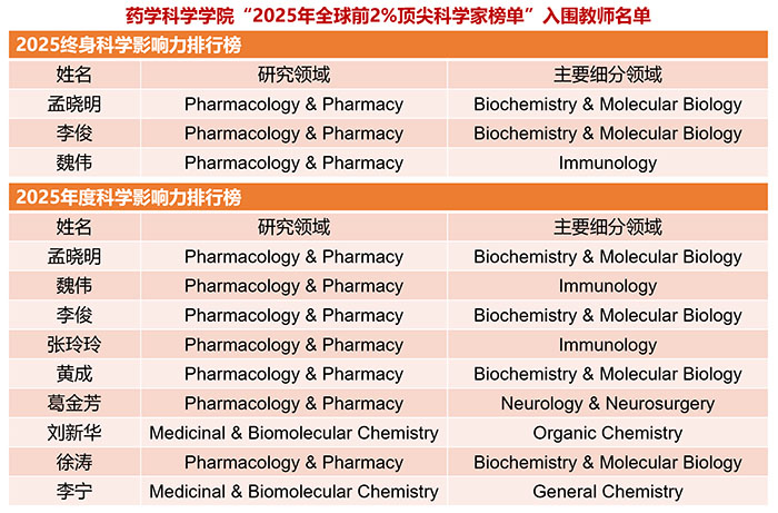 9月19日,斯坦福大学(Stanford University)和国际权威学术出版社爱思唯尔(Elsevier)共同发布2025年全球前2%顶尖科学家榜单(World's Top 2% Scientists)。药学科学学院共有9名教师入选该榜单。