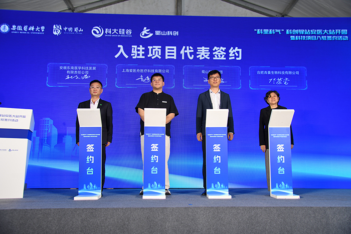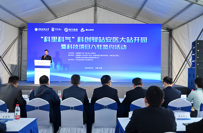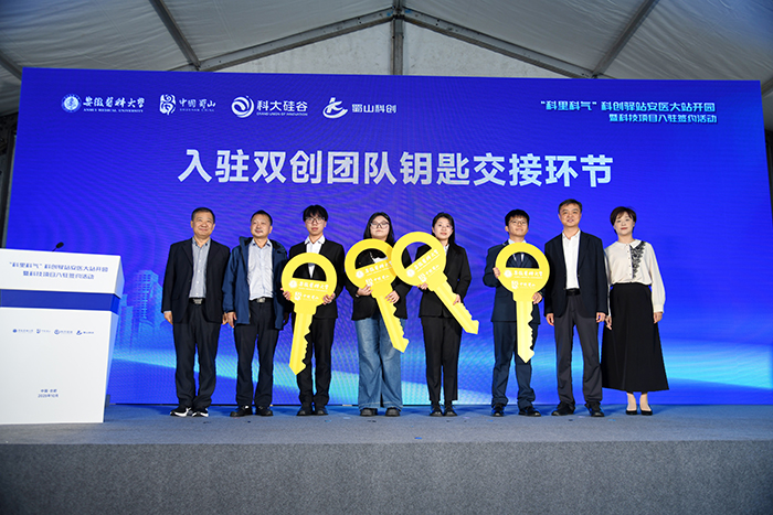 10月17日上午,“科里科气”科创驿站安医大站开园暨科技项目入驻签约活动举行。校党委书记王琦、蜀山区委书记杨森出席,并共同为“科里科气”科创驿站安医大站开园。省教育厅科研处处长梁祥君为入驻学生团队颁发钥匙。学术副校长张智出席活动并致辞,校党委常委、宣传部部长秦楠出席活动。