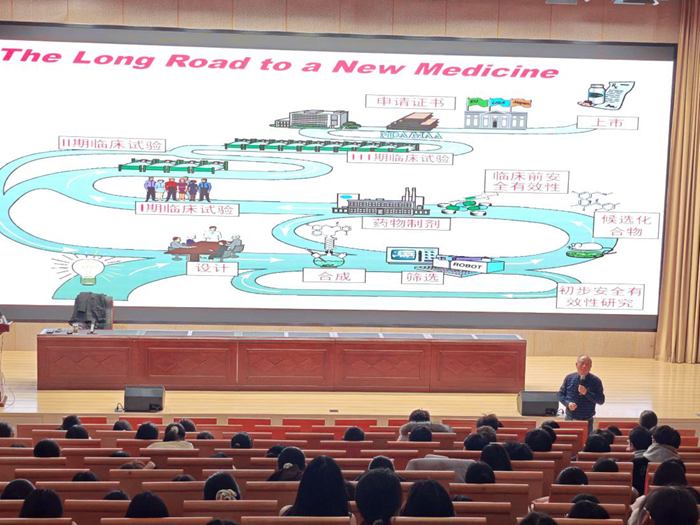 围绕《为研发"中国药”奋力奔跑》这一主题,高杉从“我们在哪”“我们是谁”“我们来这里干什么”“我们的未来在哪里”四个方面与2025级本科生面对面畅谈药学使命,共话职业未来。他回溯了百年安医和药学学科的发展历程,重点介绍了邢文鑅、徐叔云等药学先驱的学术贡献与治学精神,通过数据、图表等全面展示了学校药学学科底蕴和发展进程。谈及专业使命,高杉号召广大学子,深入学习贯彻习近平总书记关于“研发生产适合中国人生命基因和身体素质的‘中国药’”重要讲话指示精神。他还结合肿瘤、糖尿病、疟疾等重大疾病的药物研发历程与作用机制,生动阐释了药学学科在守护人民健康中的关键作用,勉励同学们以“国之大者”为念,将个人小我融入“健康中国”建设大我。
