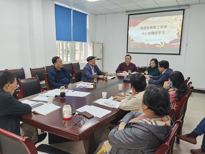 10月28日,离退休教职工党委理论学习中心组召开学习会,学习贯彻习近平总书记重要讲话指示精神,离退休教职工党委书记谢宜鹏主持会议。