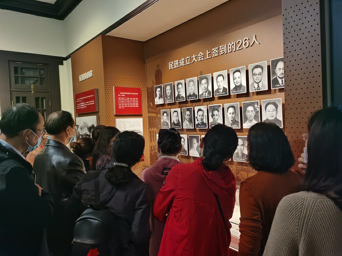 民进旧址纪念馆内,会员们在铜像前深切缅怀马叙伦、王绍鏊等民进主要创始人,依次参观“民进先辈的早期斗争和民进的创建”“积极响应中共中央五一口号”、“民进参与协商建国”等展区,了解了先辈们在中国面临前途命运抉择时创立中国民主促进会、开启民进事业和对我国教育文化事业做出的贡献。