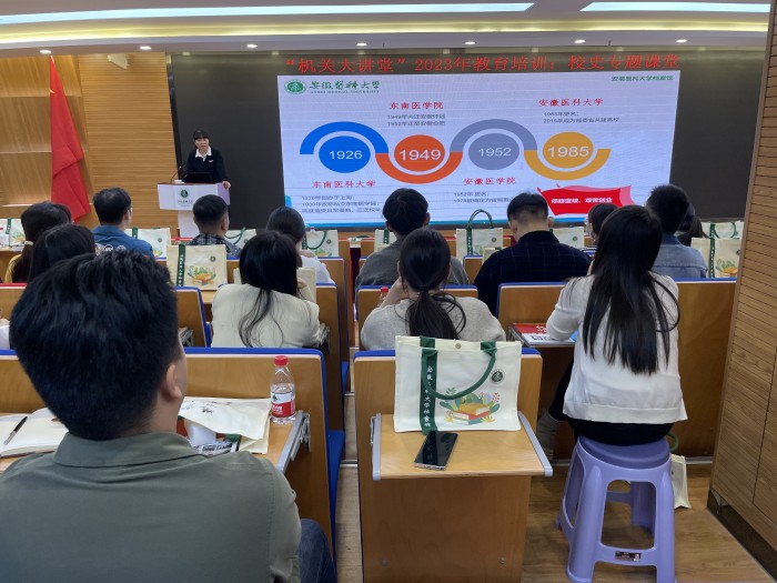 张芳从我校的建校起源入手,结合一张张精彩的图片、一个个动人的故事,详细介绍了学校在各时期的教学理念和办学思想,深情讲述学校近百年的发展成就,阐述了“好学力行,造就良医”校训的精神内涵和时代价值。讲座史料详实,实例丰富,展现了学校的光辉历史与浓厚人文情怀,充分发挥了校史文化铸魂育人的功能,让在场人员进一步加深对学校发展史、奋斗史的了解。