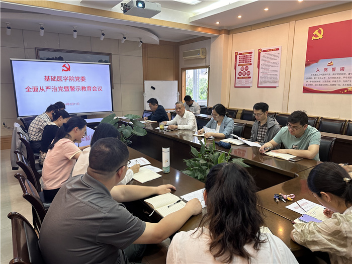 5月11日,基础医学院召开全面从严治党暨警示教育会议,集中学习习近平总书记关于党的自我革命的重要思想,认真学习省委教育工委、校党委全面从严治党会议的部署要求,解读学校2024年全面从严治党工作要点。该院党委书记储兵主持会议并作总结讲话。