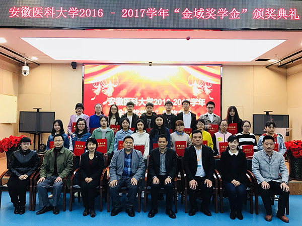4 月 4 日下午,2016-2017 学年 “金域奖学金” 颁奖典礼在新行政楼一楼报告厅举行。金域集团合肥公司常务副总经理申梦来、校党委学工部部长马军成、公共卫生学院党委书记宋玉梅、生命科学学院党委书记潘莉莉、第一临床医学院学生党总支副书记薛 磊、公共卫生学院党委副书记何婷婷等参加颁奖典礼。颁奖典礼由校党委学工部副部长吴热生主持。